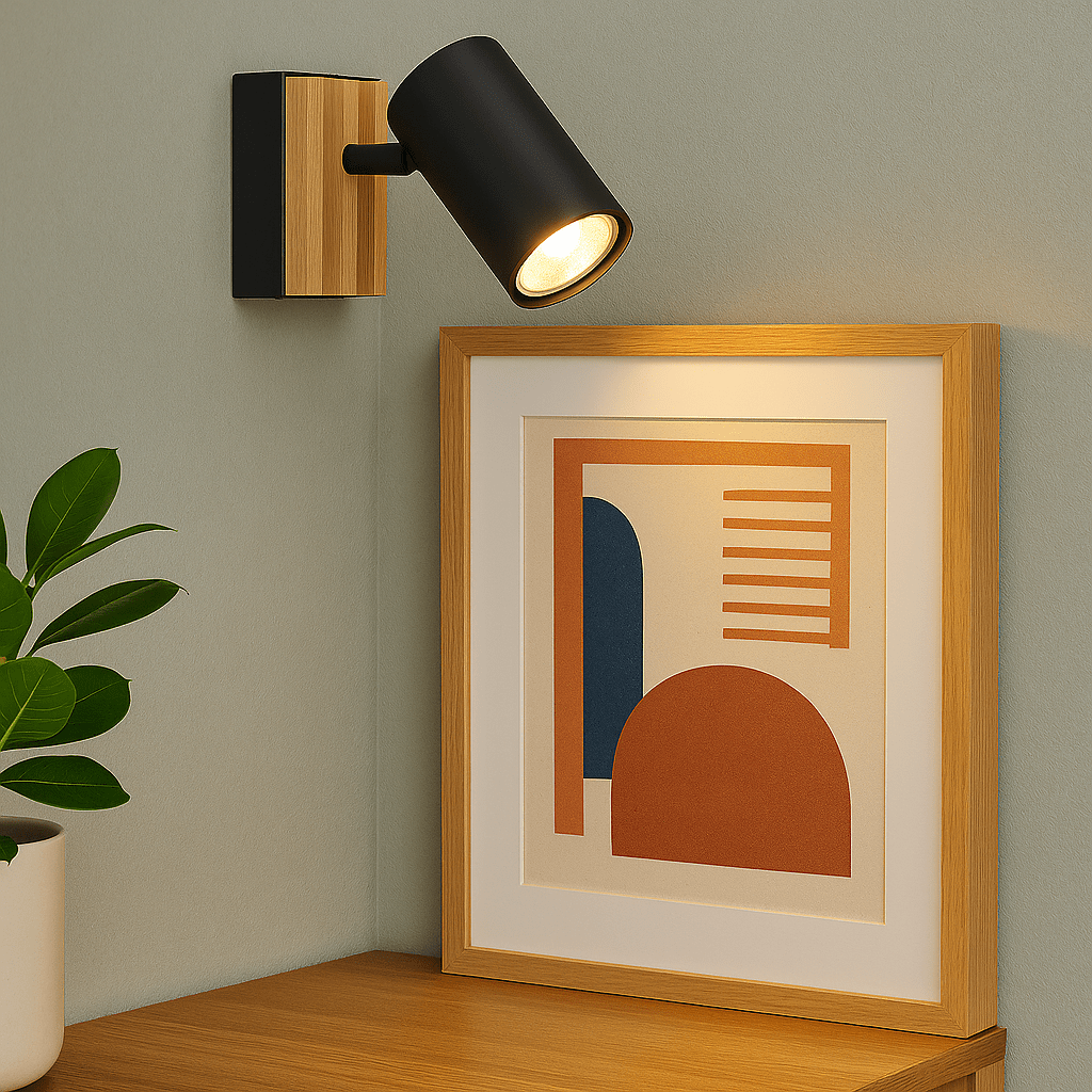 This stylish Metal Spotlight blends modern matte black metal with warm light-wood detailing for a clean Scandinavian-inspired look. The adjustable spotlight head allows you to direct light exactly where it’s needed, making it perfect for accent lighting, bedside use, hallways, or feature walls. Sleek, compact, and versatile, it fits beautifully into contemporary homes.