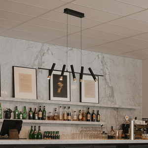 It is ideal over a dining room table or kitchen island and also suits indoor restaurant spaces.