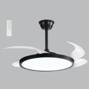 Modern, compact, and efficient — this black ceiling fan features four clear retractable ABS blades that fold away when the fan is not in use, leaving a sleek ceiling-mounted LED light. The powerful yet quiet 30W copper-coil DC motor ensures smooth airflow, while the integrated 36W LED provides selectable 3CCT lighting (3000K / 4500K / 6500K). With the included remote, you have complete control: 6 speeds, forward/reverse function, timer, and light settings.