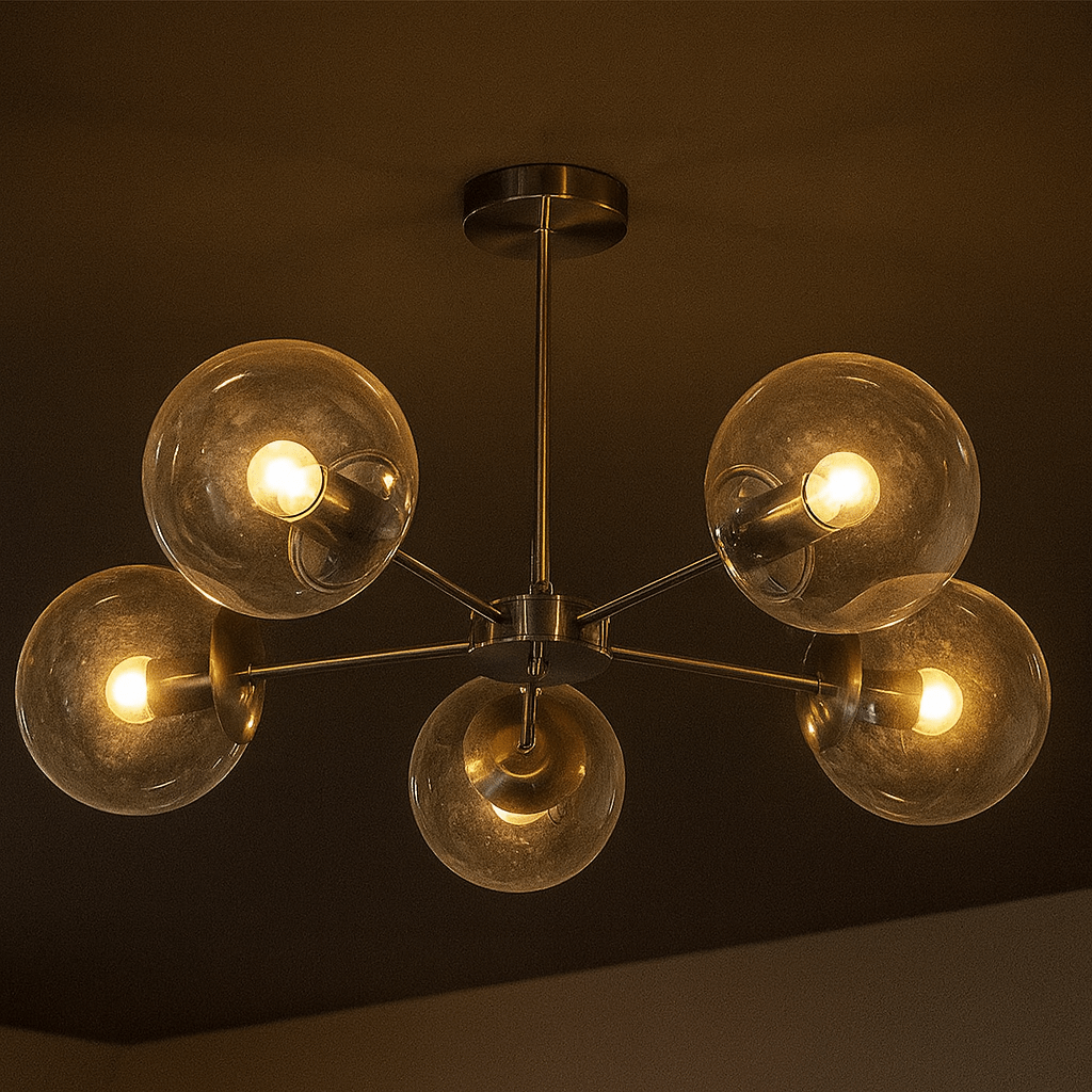 Statement dining table lighting: Hang centred over a 6–8 seater dining table to evenly illuminate meals and conversations, while the clear glass keeps sightlines open.