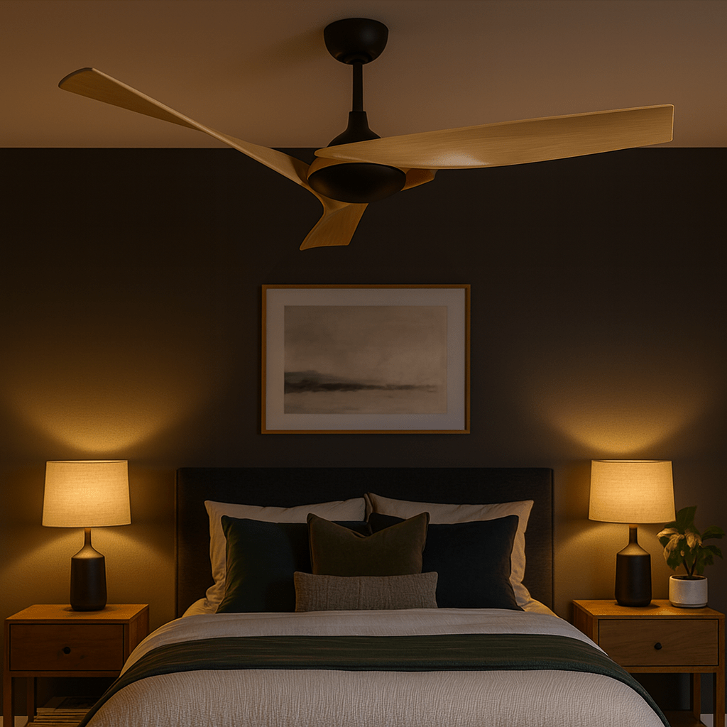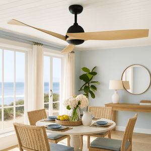 This beautifully sculpted 52-inch ceiling fan brings a modern natural touch to any space, blending a matte black motor housing with elegant light-wood ABS blades. Designed for quiet, efficient cooling, it features a powerful 35W copper DC motor and a full-function remote offering 6 speeds, reverse mode for summer and winter use, and convenient timer settings.