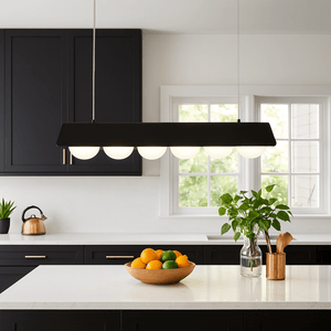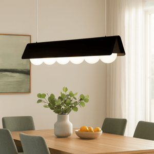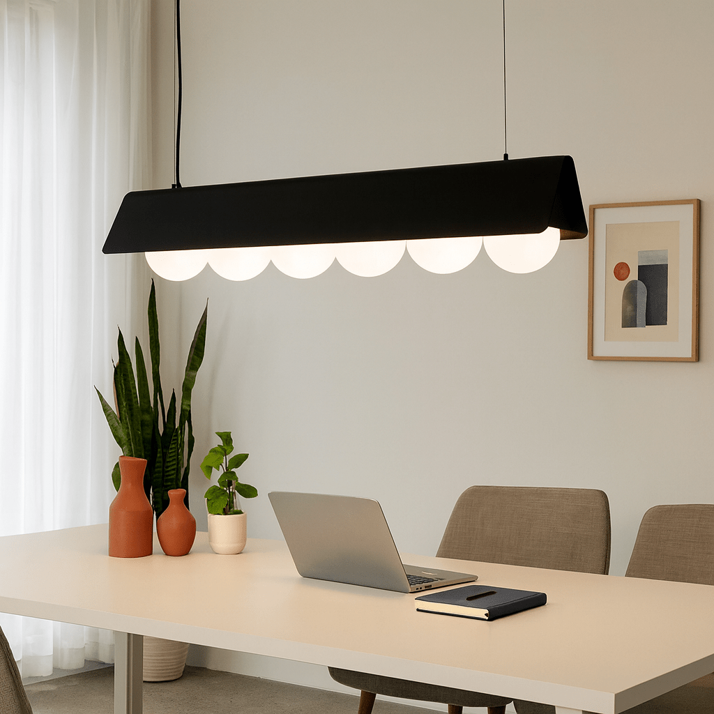 Make a statement with this elegant 6-light linear pendant, blending contemporary black metal with opal glass shades. With a generous 2.5m suspension and sleek horizontal profile, it's perfect for long dining tables, kitchen islands, or open-plan interiors seeking stylish impact and functional illumination.