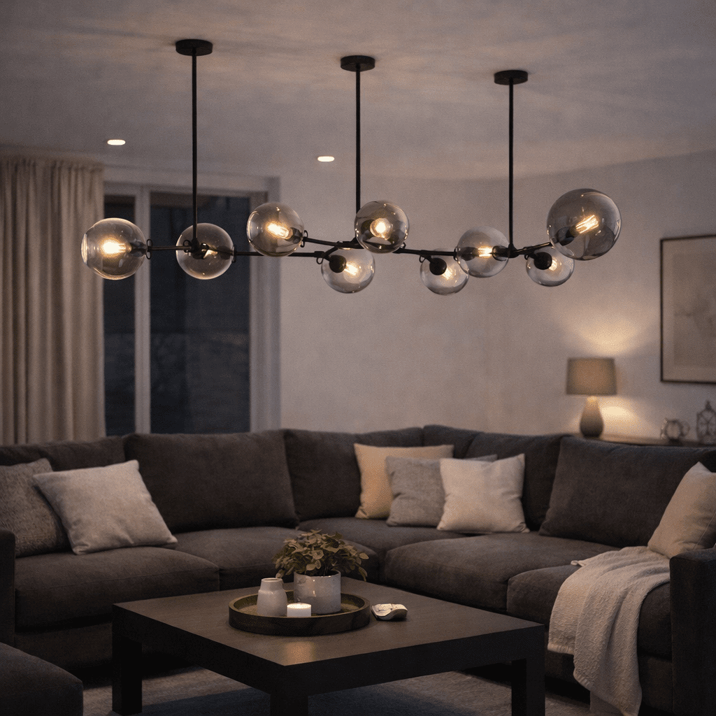 Define a living room zone: Hang above a large sectional and coffee table to visually group seating, while smoke glass reduces harshness for relaxed conversation and movie nights.