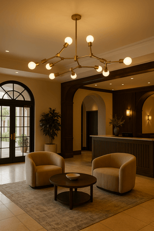 Group pendants at varying heights to elevate hotel lobby design with bespoke bronze elegance.