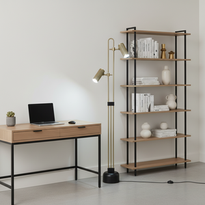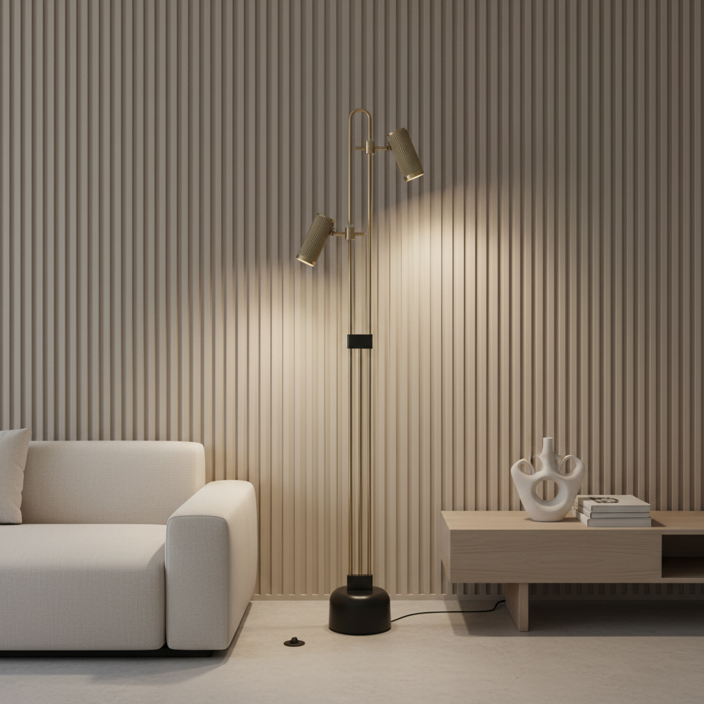 This elegant metal standing lamp features two adjustable spotlight heads, making it perfect for focused lighting in modern living spaces. The slim vertical frame and warm metallic finish add a sophisticated touch, while the compact base keeps the overall footprint neat and space-efficient.