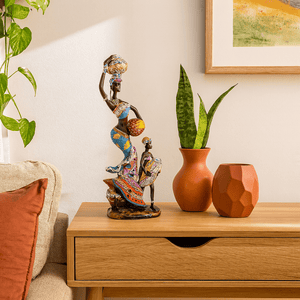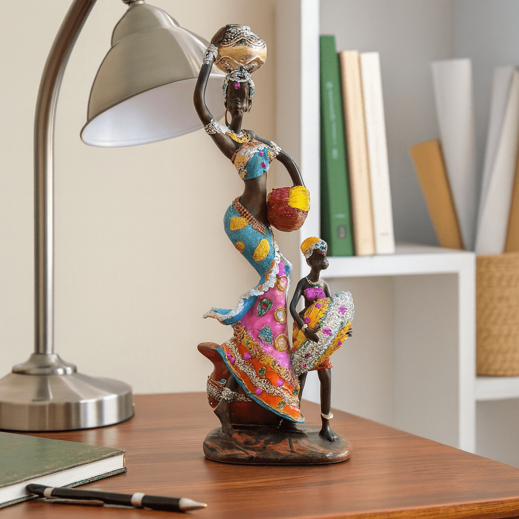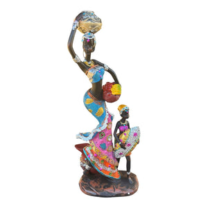 Experience the beauty of African heritage with this magnificently crafted figurine, portraying a mother and daughter in a flowing blue dress. The vibrant color palette and exquisite detailing enhance any home or office with a warm, cultural charm. Handcrafted from high-quality ceramic, it's a perfect addition to modern and traditional interiors, adding a sophisticated touch.