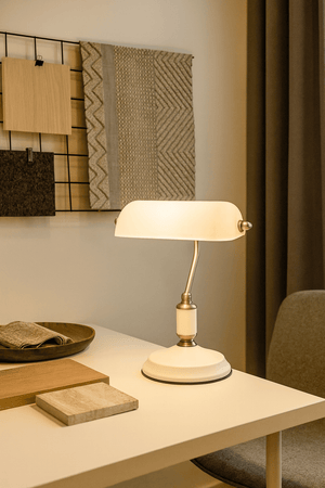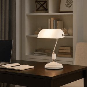 Bring focused, comfortable light to your home office or office desk with this classic bankers-style table lamp. The white and satin nickel finish adds a neat, professional look, while the sturdy steel construction makes it a practical everyday choice for reading, admin, or detailed work indoors.
