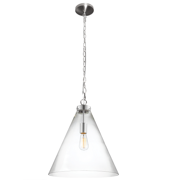 Enhance your interior with the Beltone Glass Funnel Pendant Light, a perfect blend of modern design and functionality. Its sleek satin chrome finish and clear glass create a sophisticated ambiance, making it an ideal choice for any contemporary home.