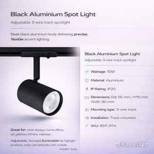 Introducing the Black Aluminium Spot Light with a 3-Wire Track, crafted from premium aluminium for a contemporary, sleek design. This spotlight offers adjustable lighting solutions perfect for modern homes and businesses, targeting users who value flexibility and style. Ideal for accent lighting or task-oriented spaces, it effortlessly combines functionality and aesthetic appeal.