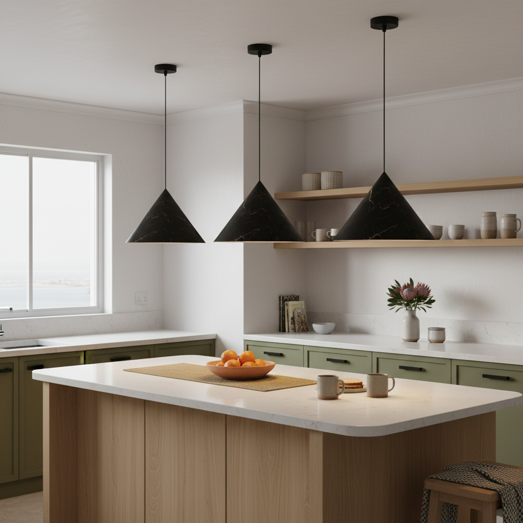 Install a row of two or three pendants above a kitchen island or dining table for balanced lighting and a bold designer statement.
