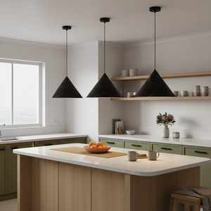 The Black Metal Pinnacle Pendant is a bold contemporary lighting piece designed to add strong visual presence to modern interiors. Its wide 40cm metal shade creates a striking silhouette while directing light downward, making it ideal for dining tables, kitchen islands, and feature areas where focused lighting is required.