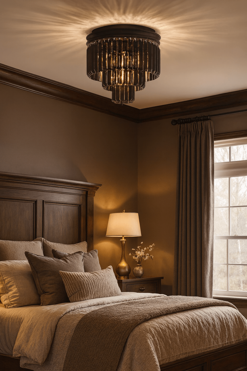 Bedroom ambient glamour lighting: Install centrally in a master bedroom for gentle, comfortable illumination that feels luxurious, freeing bedside tables from lamps and keeping the space uncluttered.