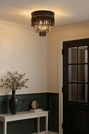 Add a touch of luxury to your indoor living room or bedroom with this flush-mount ceiling light, finished in black and dressed with smokey crystals. It works beautifully as feature lighting while still providing comfortable general light, making it ideal for everyday use in a stylish home setting.