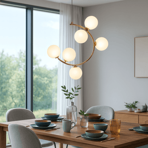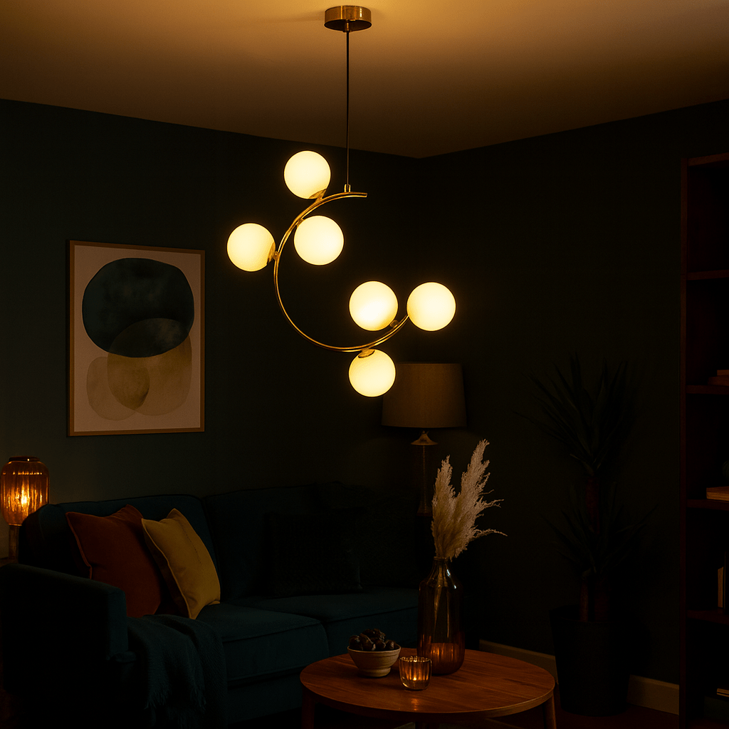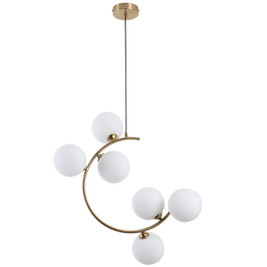 This beautifully sculpted brass pendant is a true statement piece designed to elevate any modern interior. Featuring six frosted white glass spheres arranged along a gracefully curved frame, it delivers soft, atmospheric lighting with a striking artistic presence. Perfect for dining rooms, entrances, lounges, or double-volume spaces needing something bold yet elegant.