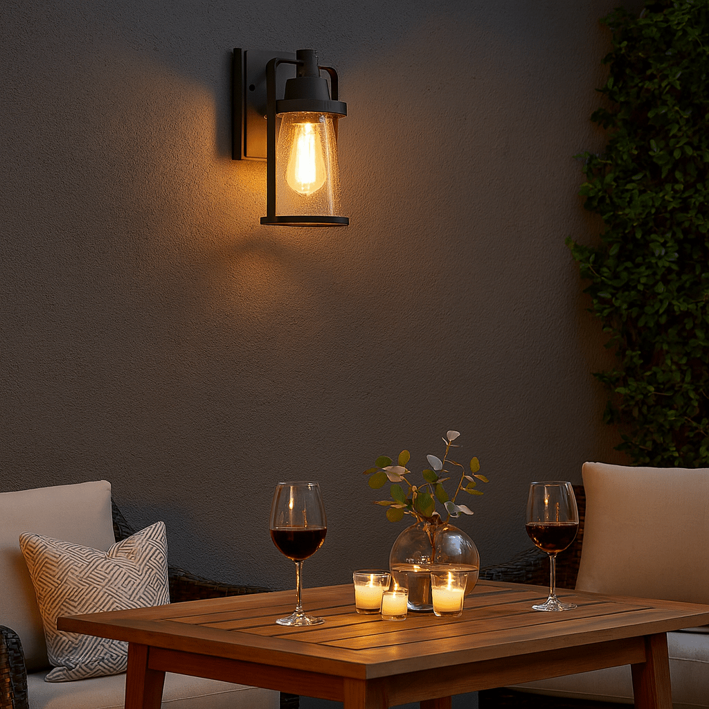 Mount on patio walls to create a warm, inviting atmosphere for evening gatherings and alfresco dining under soft, speckled light.