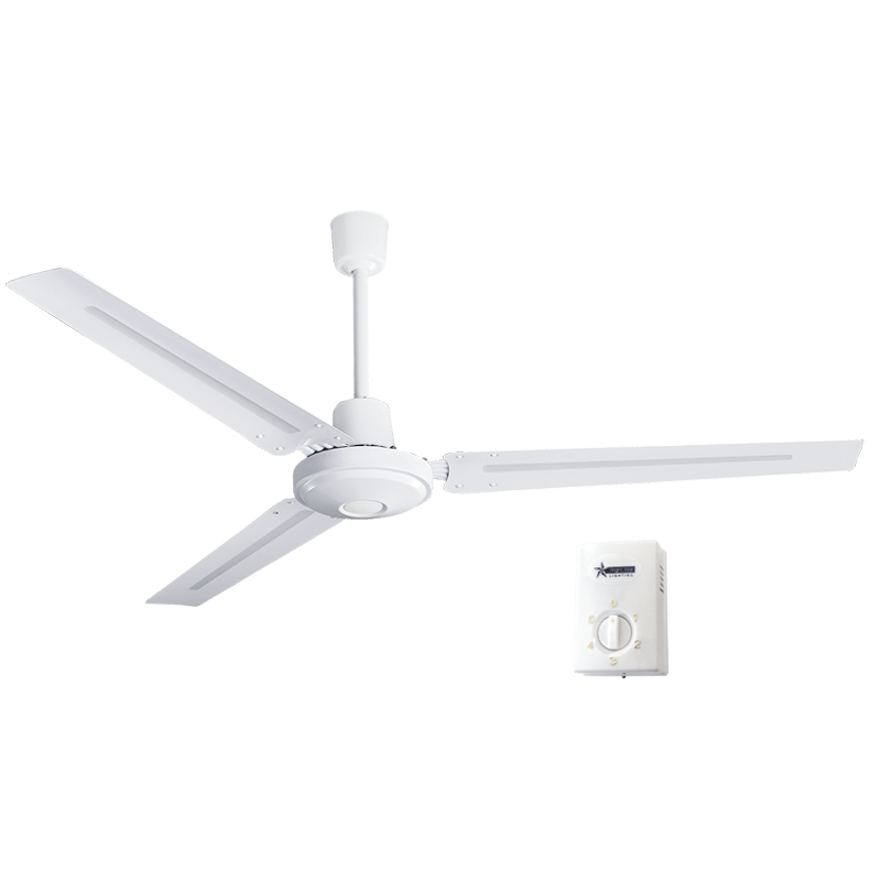 Introducing our Ceiling Fan with 3 robust metal blades, designed for industrial strength cooling in large spaces. With a 70W copper coil AC motor and a 5-speed wall control, this fan ensures optimal airflow and durability. Backed by a 2 Year Warranty, it's a reliable addition to any setting.