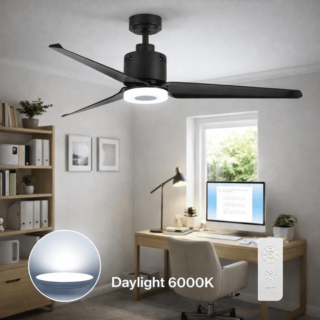 Home office productivity: Improve focus during warm afternoons by moving stale air while the 6000K LED provides crisp task lighting without adding heat, perfect for a small study.