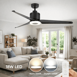 Summer living room comfort: Keep the lounge cool and bright with gentle circulation and the 18W LED; select warm 3000K for relaxed evenings and daylight 6000K for chores.