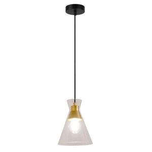 The pendant is constructed from metal and clear glass with black and gold accents for a luxurious look.