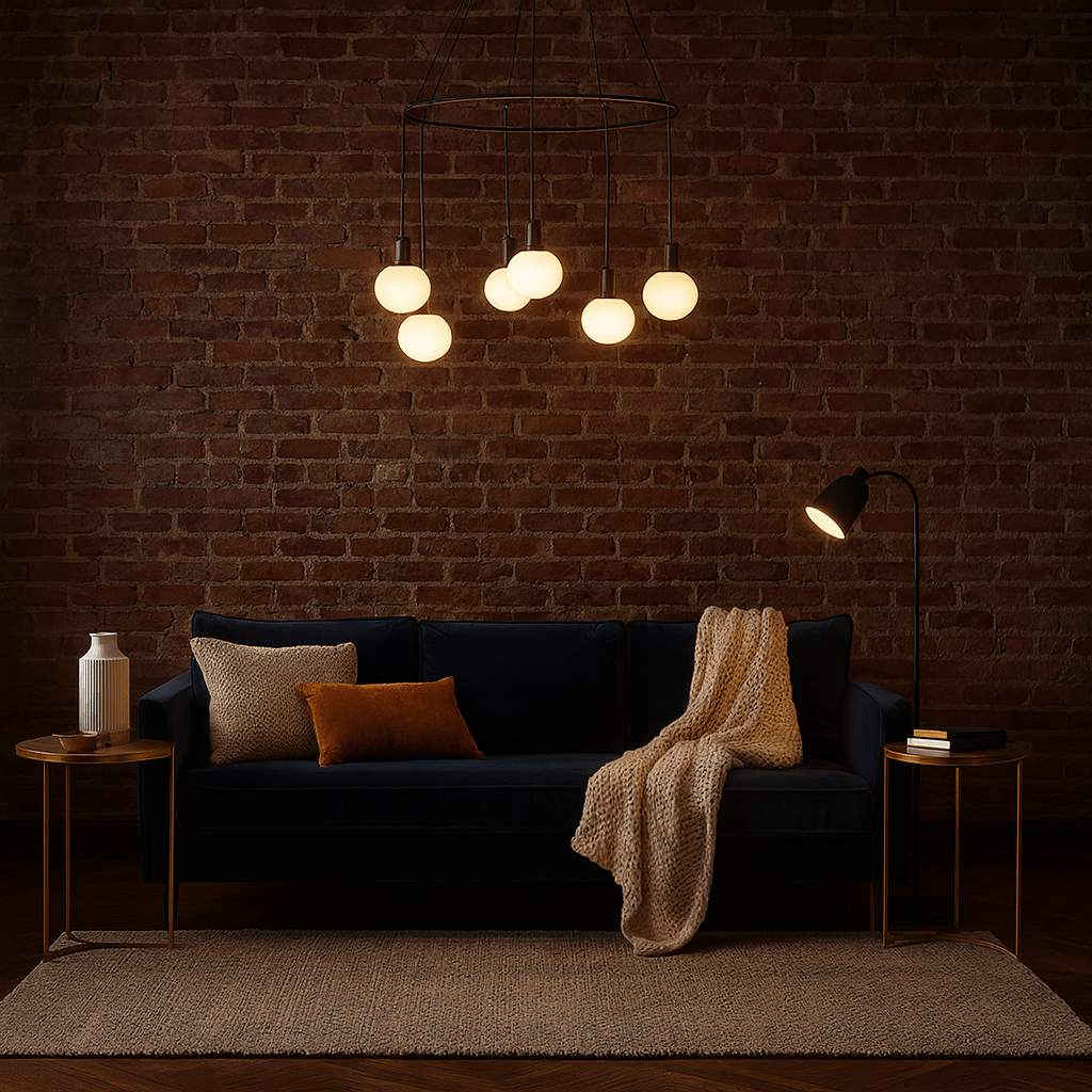 Install centrally in the living room to enhance evening relaxation with soft, diffused glow from opal white shades.
