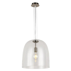 The pendant is crafted from clear glass with chrome metal detailing for a modern and elegant finish.