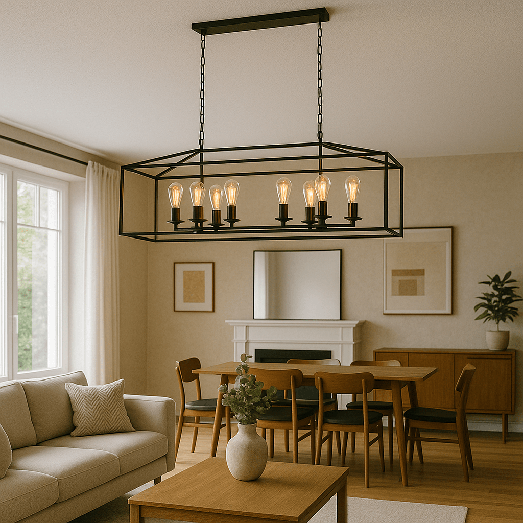 The Delport 8 Light Rectangular Ranch Iron Pendant brings a touch of sophistication and rustic charm to any room. With a striking black finish and a robust iron frame, this pendant light is designed to enhance your living space while providing ample illumination. Perfect for dining areas, kitchens, or entryways, its bold design and quality craftsmanship make it a standout piece.
