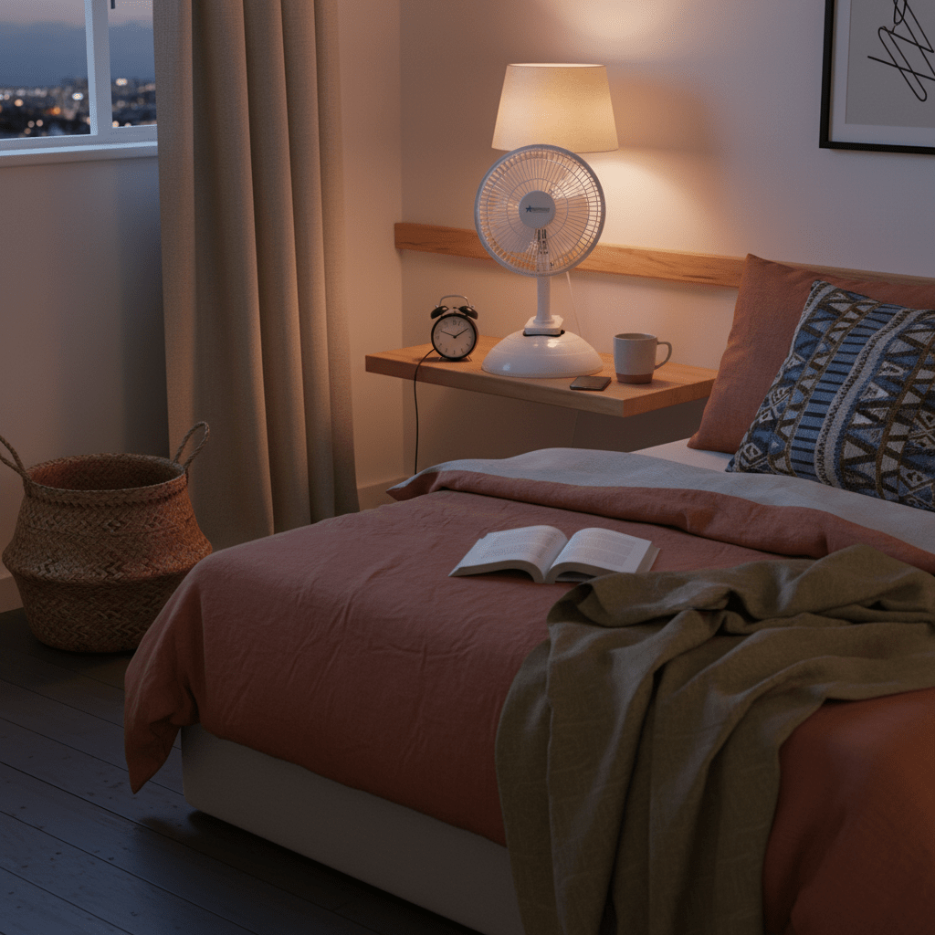 Quiet bedroom airflow: Set it on a bedside table for gentle breeze while you sleep, angled away from your face to stay cool without drafts.