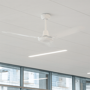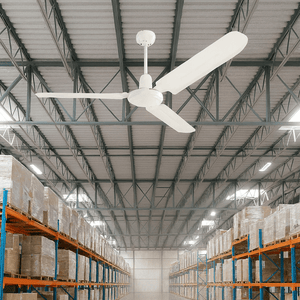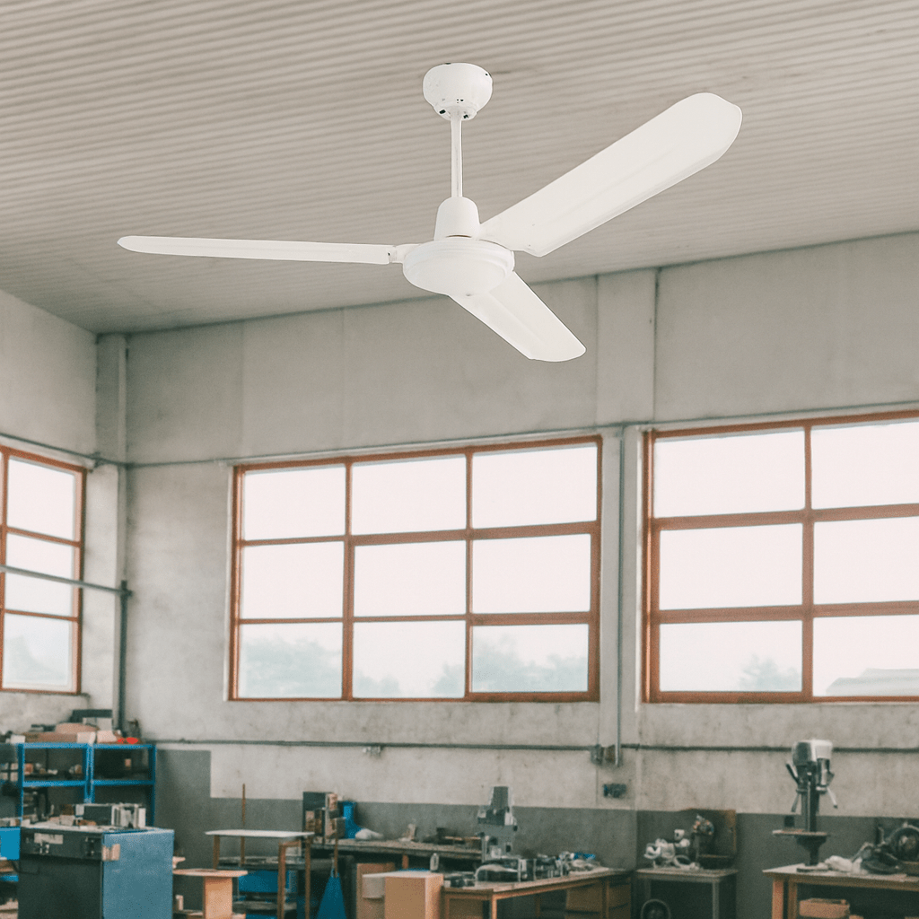 Introducing the F12W, a white industrial ceiling fan designed for robust performance in challenging environments. Equipped with three blades and made from pressed steel, this fan ensures reliable air circulation for factory floors, warehouses, and other industrial spaces. Its durable design caters to users seeking an efficient and long-lasting solution for powerful airflow where it's most needed.