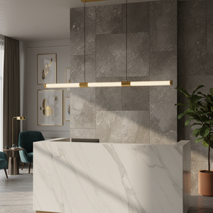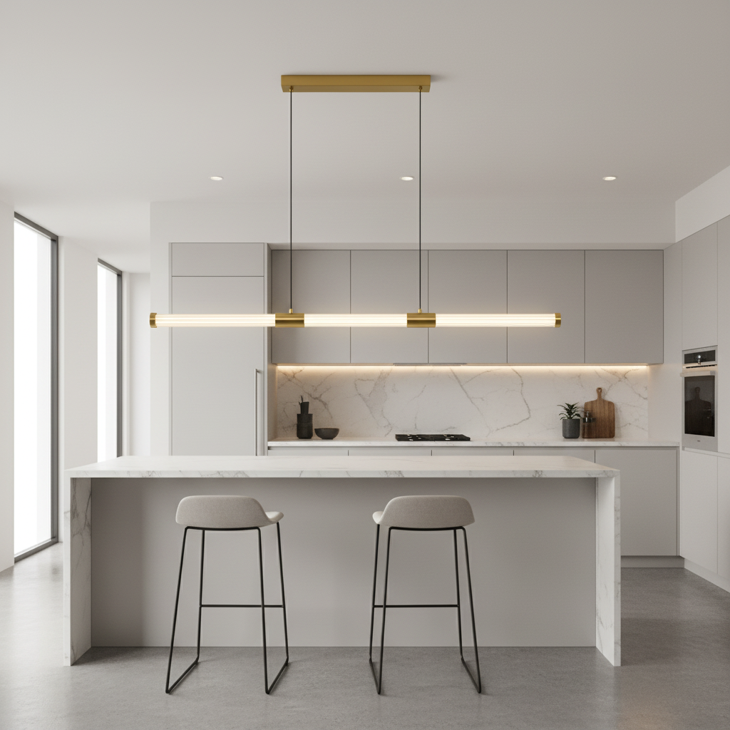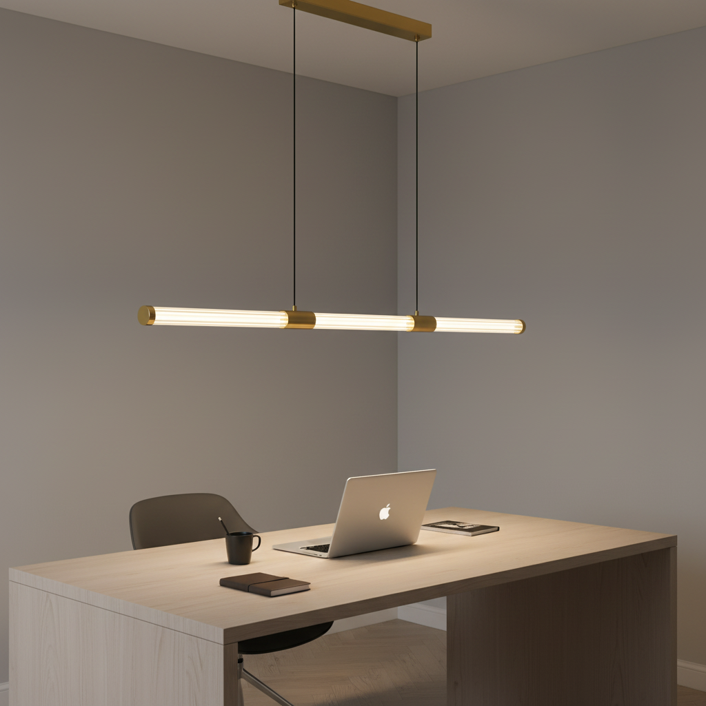 The Golden Wand LED Pendant is a sleek modern lighting feature designed to bring elegance and clean architectural lines to contemporary interiors. Its slim cylindrical diffuser is suspended from a refined gold canopy, creating a minimalist yet luxurious statement perfect for dining tables, kitchen islands, and modern workspaces.