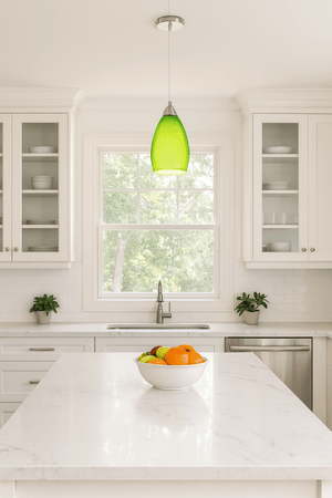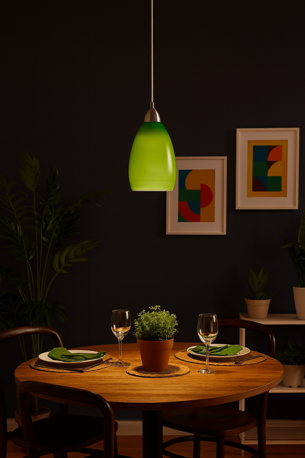 The Green Satin Chrome Pendant Light features an elegant double glass design, combining a sleek satin chrome finish with versatile applications. It's perfect for contemporary spaces, offering adjustable hanging height and works with various decor styles, ideally suited for homeowners seeking modern lighting solutions.