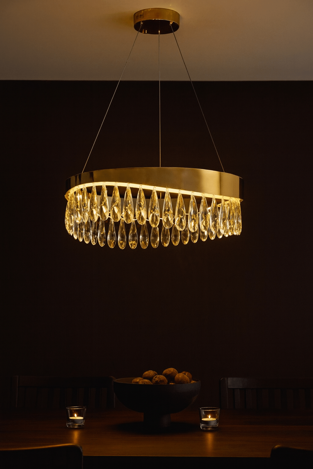 Hang chandelier so bottom sits 75–90cm above the dining table or 2.4m above the floor for balanced illumination.