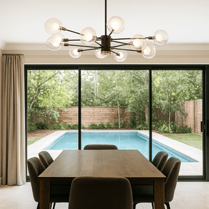 Anchor your living space with a bold black and gold statement light, blending style and function for cozy movie nights or cocktail parties.