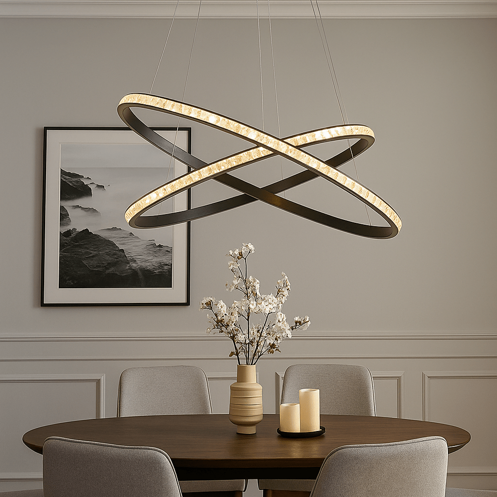 The K-LED-485-2 Black LED Pendant Light is a sophisticated lighting fixture that merges modern design with timeless elegance. Its double oval crystal ring structure not only illuminates but also enhances the aesthetic charm of any space, making it a perfect centerpiece for contemporary interiors.