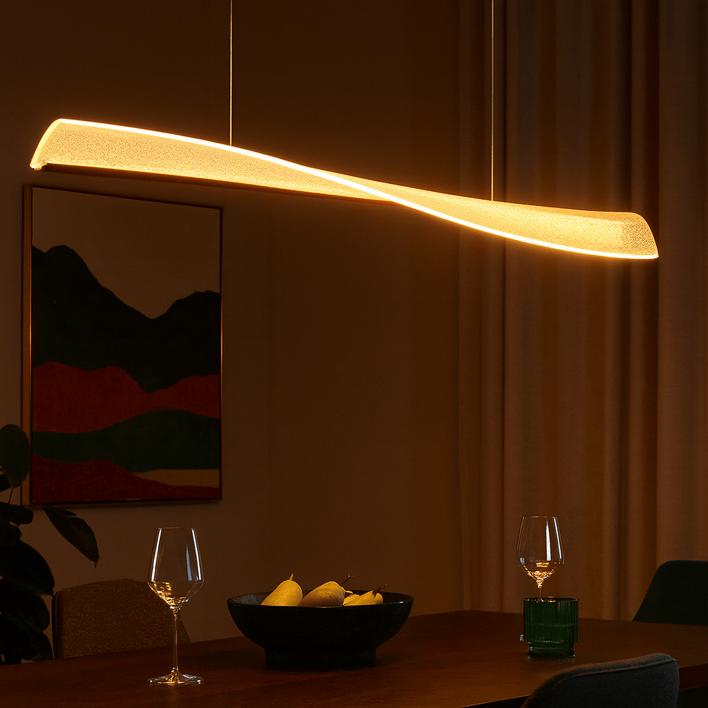 The Wave Acrylic LED Pendant Light encapsulates modern sophistication with its satin gold finish and clear glitter acrylic design. Perfect for stylish interiors, this energy-efficient pendant creates a warm, inviting atmosphere, bringing luxury and cozy lighting to any room, be it a home dining area or a chic commercial space.