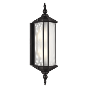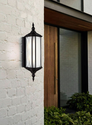 Enhance your outdoor areas with the Kimberley Outdoor Patterned Wall Light. This stylish fixture combines functional lighting with an artistic touch, featuring a textured black finish and patterned frosted glass that adds sophistication to any exterior setting.