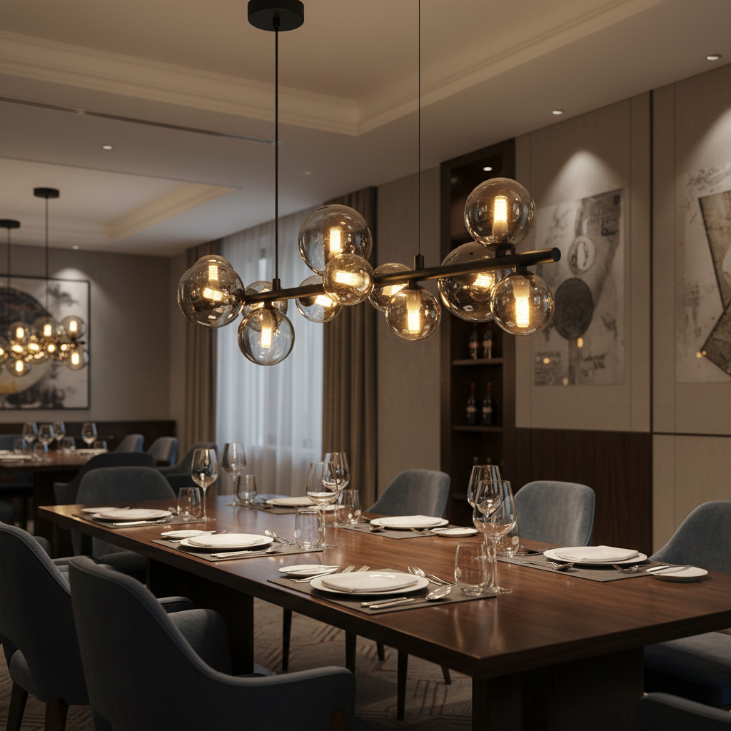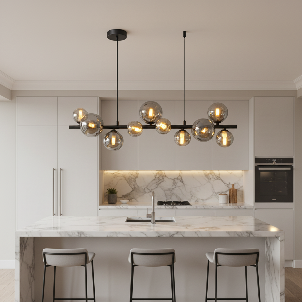 Each spherical glass shade softly diffuses the light from the included G9 LED bulbs, producing a warm and inviting ambience while maintaining a modern architectural presence. The elongated design makes it particularly suited to long dining tables, kitchen islands, or reception areas where balanced, decorative lighting is required.