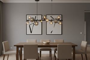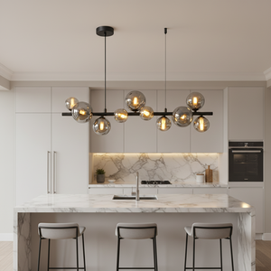 The Large Horizontal Bubble Glass Pendant is a bold contemporary statement light designed to transform dining areas, kitchen islands, and modern living spaces. Featuring a sleek black horizontal bar adorned with ten smoke glass bubble shades, this striking fixture creates a layered glow that adds depth and visual interest to any interior.