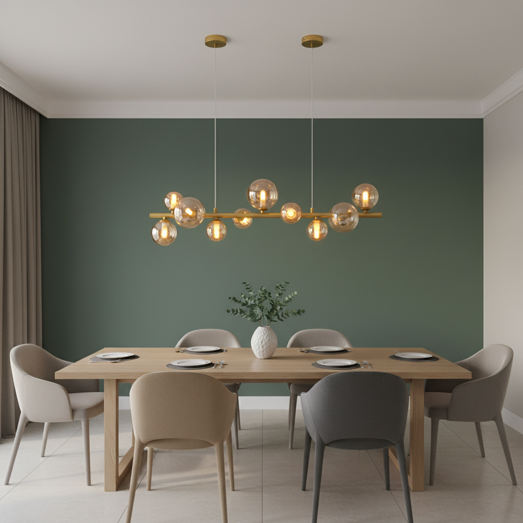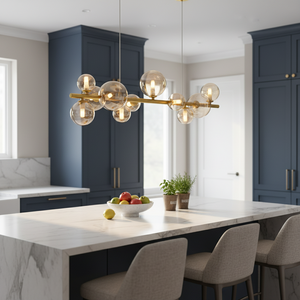 The Large Horizontal Bubble Glass Pendant is a luxurious modern statement light designed to elevate dining spaces, kitchen islands, and stylish interiors. Featuring a sleek gold horizontal bar adorned with ten elegant amber glass bubble shades, this striking fixture creates a warm, layered glow that adds both depth and sophistication to a room.