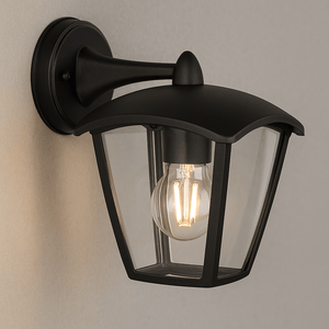 This beautifully crafted LED Black Outdoor Wall Light offers a classic 4-panel down-facing lantern design, perfect for adding a touch of elegance to your exterior space. Built with durable die-cast aluminum and clear polycarbonate, it is expertly designed to withstand the elements while providing ample light for outdoor areas.