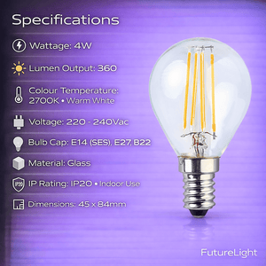 Ideal for everyday indoor lighting with a warm, welcoming glow, this 4W LED filament golf-ball bulb is a practical choice for homeowners who want efficient light without the harshness. It works well for general lighting and subtle accent touches in fittings where you want that classic filament look with modern LED performance.