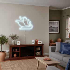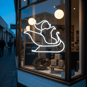 This Santa sleigh motif makes a neat feature above a TV unit or mantel, framing seasonal displays without taking up shelf or floor space. It’s also a strong choice for a storefront or glass frontage, where the crisp silhouette shows up well after dark and draws attention to promotions and festive decorations. The result is instant holiday character with minimal fuss.