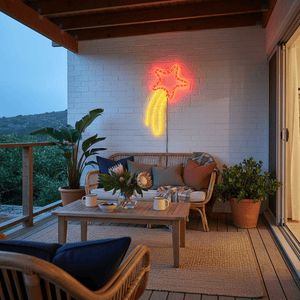 Perfect for marking your front porch or door, it creates a clear focal point visitors will notice as they arrive. It’s also ideal for a covered patio or verandah, adding festive glow behind seating without overwhelming the area. The shooting star shape is bold and visible from the street, helping guide guests to your entrance and giving evening gatherings a bright, cheerful touch.