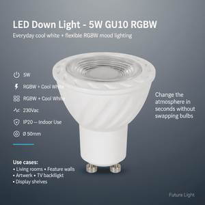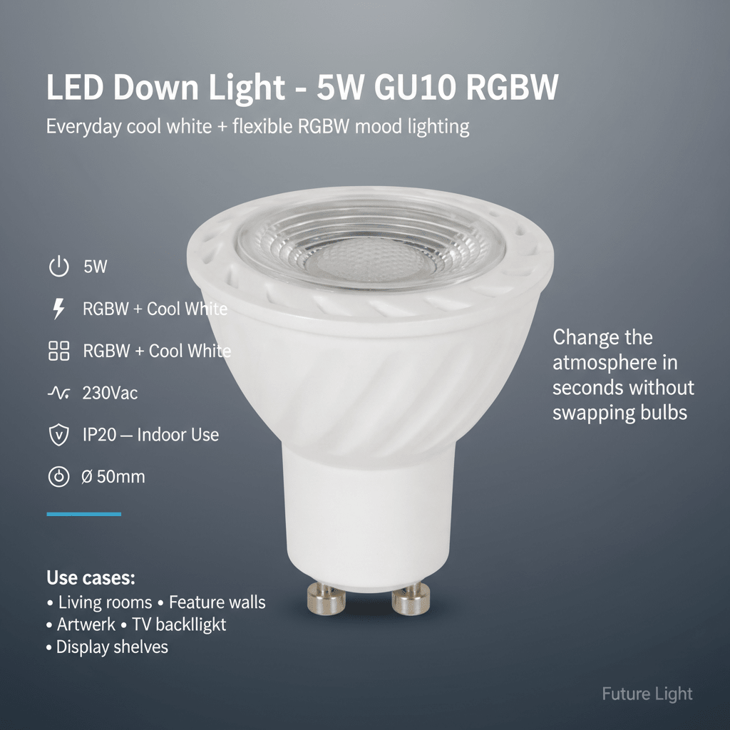 Add a splash of colour to your living room with this 5W GU10 LED downlight bulb, ideal for everyday lighting as well as accenting a feature wall, artwork, or display shelves. It gives you flexible RGBW colour options for setting the mood indoors, while still keeping things practical and energy-efficient.