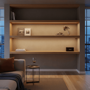 Display cabinet glass wash: Install in the cabinet base to back-wash glassware or collectibles with an even glow, avoiding dotting while hiding wiring within the recessed channel.