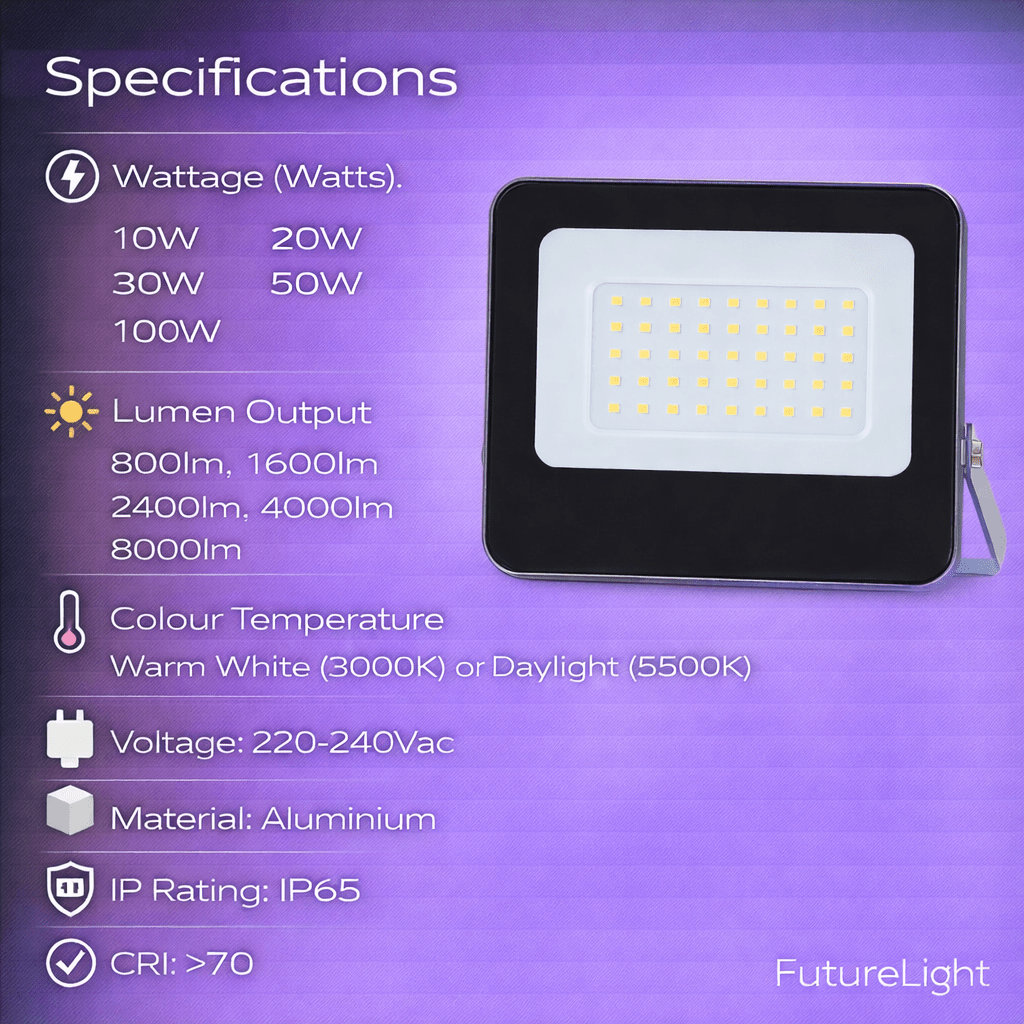 These mains-powered LED flood lights are a practical choice for outdoor use where you need reliable general lighting with the option to aim the beam for more directional coverage. They work especially well for feature lighting around a retail space and for lighting up signage, giving you a clean warm or crisp daylight look depending on the colour temperature you choose.