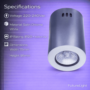 This surface-mounted GU10 downlight holder is a neat, modern choice for indoor spaces where you want focused light exactly where you need it. Ideal for adding accent lighting in a living room (or creating practical task lighting over specific areas), it takes a GU10 LED globe of your choice so you can decide on brightness and colour temperature, and it finishes off cleanly in satin chrome or white.