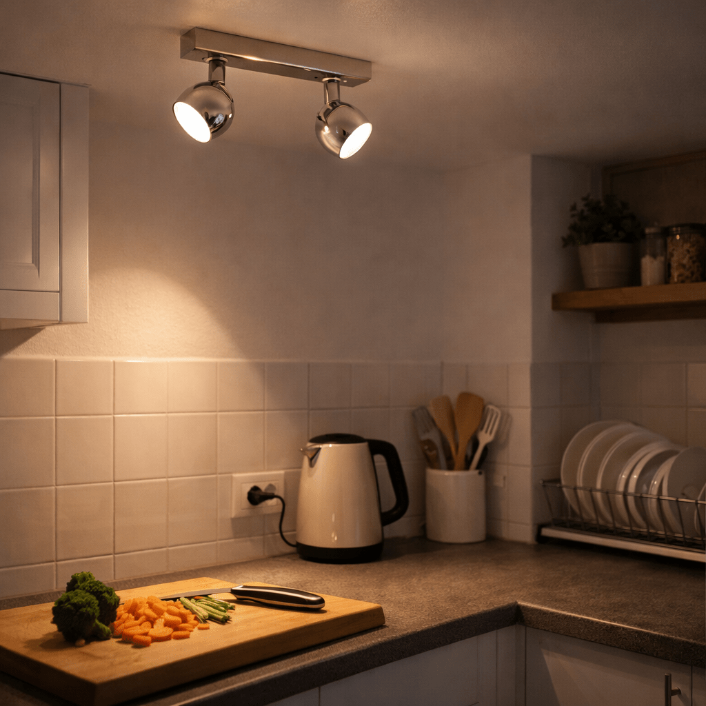 Kitchen counter task lighting: Mount above the kitchen counter, directing one head to the chopping zone and the other to appliances for warm white evening prep.