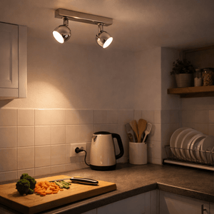 This spotlight is ideal where a small pool of light makes a big difference — over a kitchen counter for clear task lighting while you prep food, or beside a bed to make a cosy reading corner. Because it lights only the spots you choose, you get good visibility exactly where you work or read, while keeping the rest of the room softly lit and uncluttered.