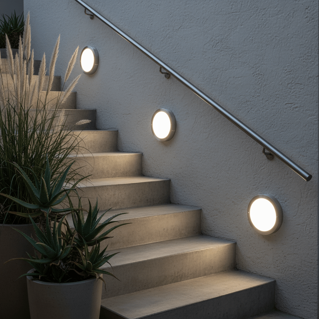 Guiding light for garden steps: Mount one per step along outdoor stairs to provide safe, low-glare wayfinding with daylight clarity during evenings and early mornings.
