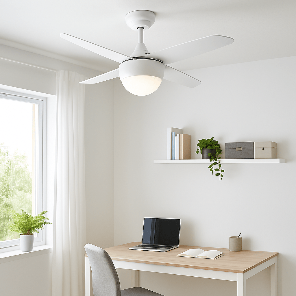 The Matt White Ceiling Fan with Opal Glass Shade blends sleek design with functionality, making it an excellent addition to modern homes. Constructed with durable steel and energy-efficient ABS, it ensures longevity and reliable performance. Ideal for style-conscious homeowners seeking both aesthetics and efficient air circulation, this fan complements any interior decor while enhancing comfort.